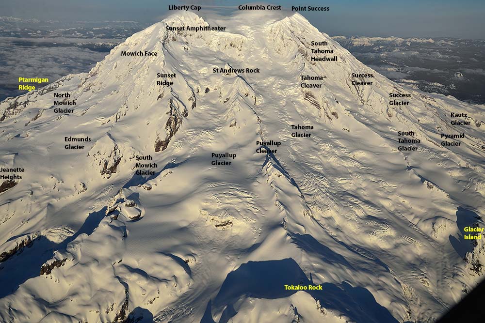 Rainier Aerial Photography: I took the  below two images of Mt Rainier from my climbing partner Mike's lightweight aircraft to give you a good idea of the terrain of the peak. In the photo below, you can see the side of the mountain that most climbers use to gain the summit of this magnificent mountain. Coming from the Paradise Lodge parking area, most folks climb up via the Muir Snowfield and use Camp Muir (as seen below) for a place to layover and then finish the climb the next day. The blue line shows the route we took to summit Mt Rainier.