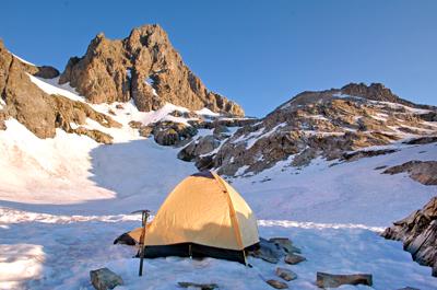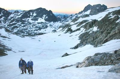 We usually get well under way before sunrise. Pre-dawn starts are a great way to gain altitude without battling the blazing high altitude sun. Crossing snow fields is easy with headlamps in the dark. If the terrain is more technical, you need to plan accordingly. In the above left hand photo you can see us negotiating the lower slopes of Mt Ritter /Banner as we work our way up to the Ritter/Banner Saddle. In the upper right hand image you see a view looking down slope just before reaching the saddle. This was the easiest part of the climb being that it was a pretty straight forward snow/ice climb with crampons and ice ax. Later in the season this section becomes a lot harder because you will then have to fight your way up loose rock and scree.