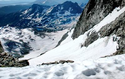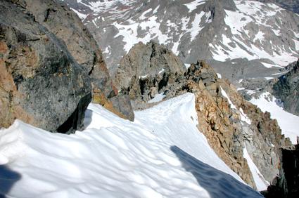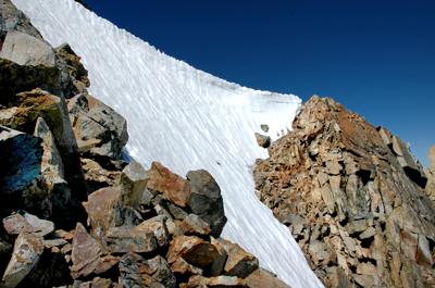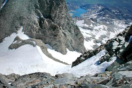 A fantastic view of a snow and ice wall high up on Mt Ritter in the image to the left. Note the cornice at the top. It is important to take notice of the upper overhanging snow sections so that when you get to the top of the structure you don't venture too close to the edge. Cornices are very dangerous, to say the least, and traveling above or below them should be avoided if at all possible.In the above right hand image, you see a view looking down on the snow structure that is shown in the above left hand photo. We traversed the below ridge in order to keep on course. But as mentioned above, we stayed just enough to the left of the cornice in order to avoid the danger of it collapsing and taking us with it.
