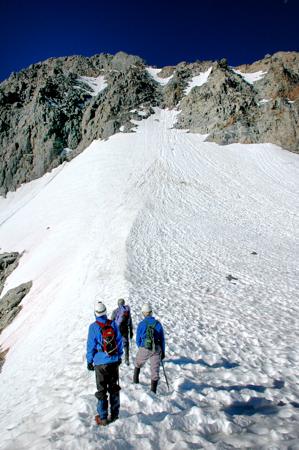 After gaining the Ritter/Banner Saddle (above photo to the left), we contemplate the next section. At the Saddle you have a choice to either climb Banner Peak or Mt Ritter. On this trip we choose to do Mt Ritter. As you can see, traversing the saddle is easy enough, and we made quick work of it. We always try to make maximum use of good snow and ice when Mountaineering. They are a great way to gain altitude quickly if you are carrying an ice ax and are wearing crampons.