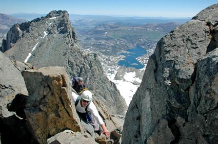 Sean and Eddie exiting the north face section (photo upper left), and rounding a small block before reaching the final summit approach. Not much more to go before reaching the top of Mount Ritter. In the above right hand photo, you see a view looking down on Banner Peak (center) from near the summit of Mt Ritter. One of the many rewards of mountain climbing, are the superb views.