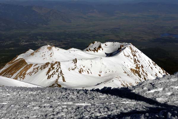 Climbing Mt Shasta is a memorable and challenging experience. During the mid-19th Century the climbing excitement was magnified by the fact that it took a considerable amount of effort just to reach the mountain.The first recorded ascent of Mount Shasta was by Captain E.D. Pearce, a Yreka sawmill foreman, in 1854. Then a few years later, Clarence King climbed the peak. There were five in his party and they ascended the Shastina peak, (photo to the right) camping overnight on the rim of the crater. The next morning, after a light breakfast, they hiked the connecting saddle to Mt. Shasta's peak. King wrote in his journal: "A singularly transparent air revealed every plain and peak until the earth's curve rolled them under remote horizons. The whole great disk of world beneath wore an aspect of glorious cheerfulness. It seemed incredible that we could see so far toward the Columbia River, almost across the state of Oregon - but there stood the Pit, Jefferson and the Three Sisters in unmistakable plainness."