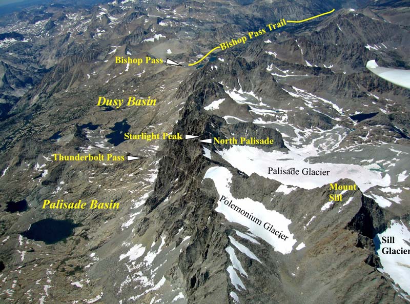 Thunderbolt Peak, Starlight Peak, North Palisade, Polemonium Peak, and Mount Sill can all be accessed from this side of the