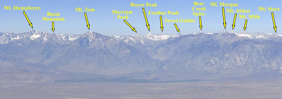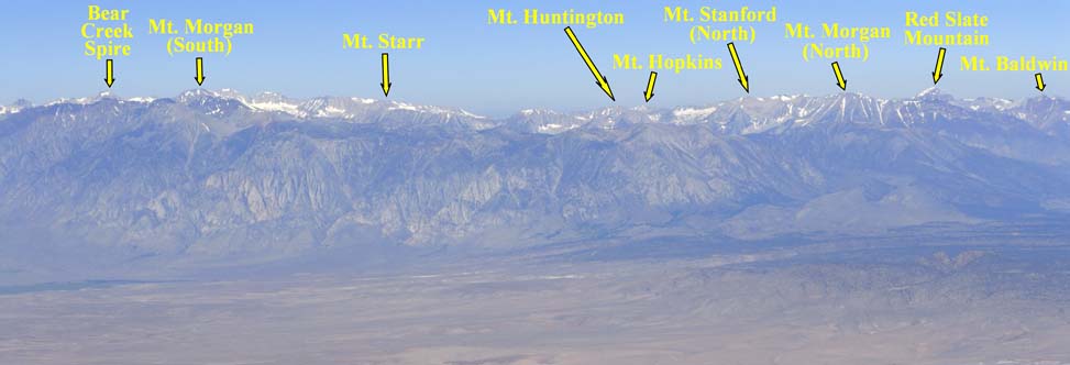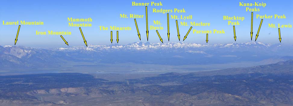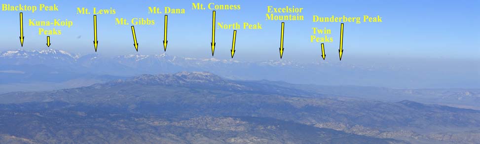 To the left Above you see a view looking south/southeast from the summit. Mt Inyo, Keynot Peak, and Waucoba Mountain are in the Inyo Range, Observatory and Mt Barcroft are in the White Mountains, and Last Chance Mountain, Tin Mountain, and Telescope Peak, are located in Death Valley National Park. Amazing what you can see from on top!