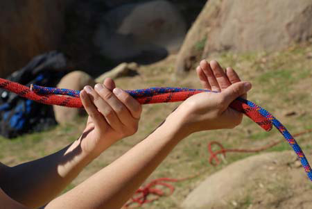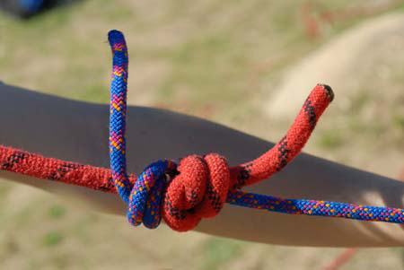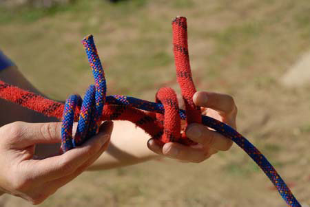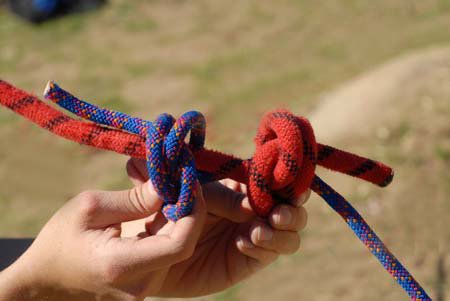 Like the "Waterman Knot" above, the use of the fisherman knot is similar. It is used to tie two ends of rope together, but that is where the similarity ends. As you will see below, it is tied in a completely different way. The "Fisherman Knot" is useful for tying two ropes together for the purpose of rappelling often times. This allows two - 50 or 60 meter ropes to be tied together. This allows the mountaineer to rappel over 150 feet and still be able to retrieve his rope. The "Fisherman Knot" is also used for tying narrow diameter rope together for protection purposes and also for short loops of rope that can be used to prusik up a fixed line for ascending purposes. The four step process of the Fisherman Knot is shown below.
