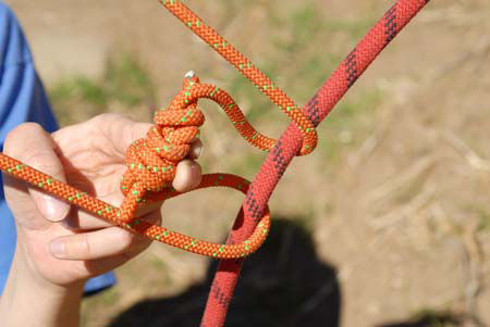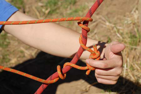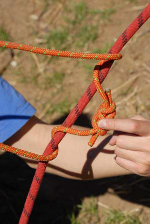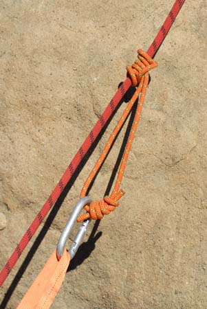 The prusik knot is used most often by climbers for self rescue situations. This knot enables a climber to ascend a single rope. This would be useful, for example, for extricating oneself out of a crevice in a glaciated region. A prusik knot would also come into play if a climber fell on an overhanging section of a rock wall and swung out of contact with the terrain. Being able to climb back up the rope to the anchor would be very useful indeed. Mechanical ascenders can also be used for these types of self rescues, but a lightweight loop of rope is many times more practical than carrying the extra weight of ascender (not to mention the expense). Therefore, I believe it is very important for any climber who ventures into the wild to have a knowledge of how to tie a prusik knot. You never know when your life could depend on it. Below is a five part illustratioin of the "Prusik Knot."